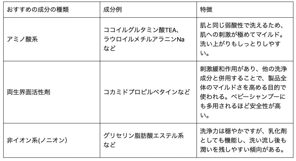 刺激がマイルドな種類:アミノ酸系(ココイルグルタミン酸TEAなど)やベタイン系(コカミドプロピルベタインなど)と呼ばれるものは、比較的肌に優しく、敏感肌向けの製品にも使われることがあります。