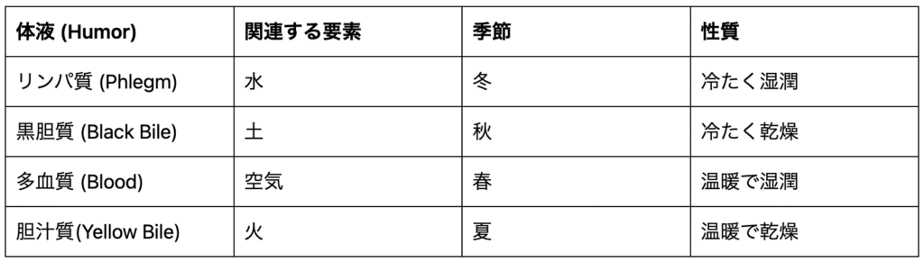人間の体内には、自然界の4つの要素(火、空気、土、水)と対応する4種類の体液があり、これらが均等に保たれている状態が「健康(ユークラシア)」であるとされました。いずれかの体液が過剰になったり不足したりしてバランスが崩れると「病気(ディスクラシア)」になると考えました。