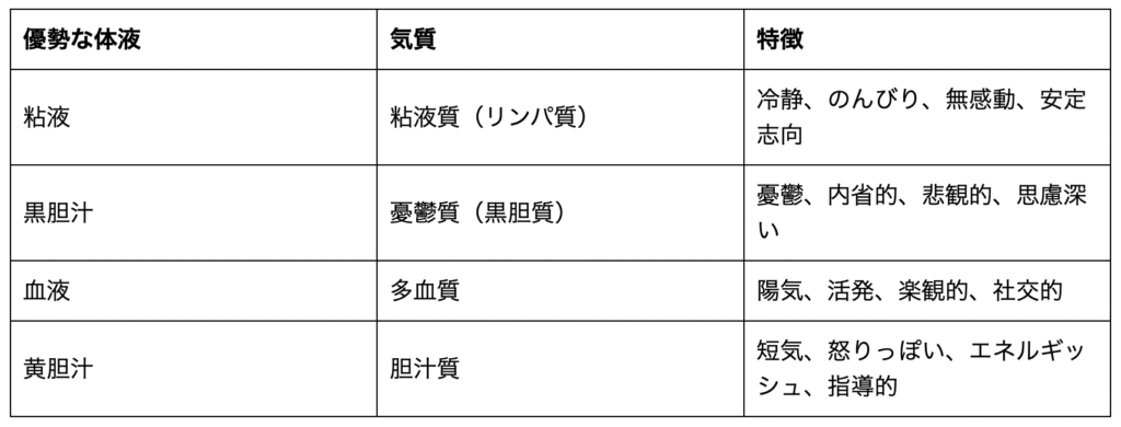 この四体液説は、それぞれの体液の優勢によって人の気質(Temperament:性格や行動傾向)が決まるという考え方にも発展しました。