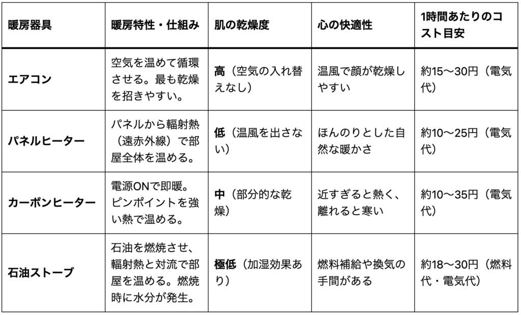 ここでは、代表的な暖房器具4種類を、肌への影響、暖房特性、そしてコストの面から比較します。