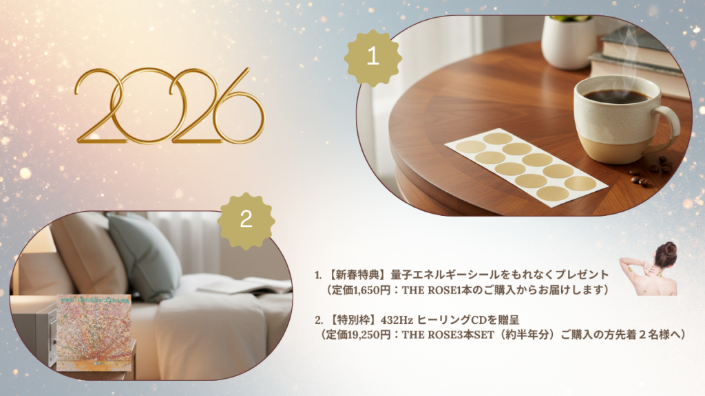「奇跡の周波数」と呼ばれる432Hzの音源を収録したCDを、1月末までに「THE ROSE」3本セットをご購入いただいた方、先着2名様へお届けします。